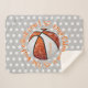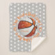 Este cobertor de pedestres cineastas sherpa fleece apresenta a imagem realista de uma bola de basquete estilizada que tem painéis coloridos cor de laranja e branco e o texto circundante, "A quadra de basquete é o meu lugar feliz" em laranja numa fonte divertida e casual, escrita à mão, com dois contornos cardíacos desenhados à mão - flores delicadas, penas e paisagens são padronizadas nos painéis laranja do basquete - um pequeno padrão de pontos de basquete sobrepõe o plano de fundo da cinza personalizável - katz_d_zynes