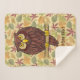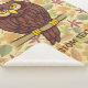 Ilustração de desenho animado de coruja sentada em galho de árvore sobre fundo bege claro.