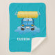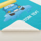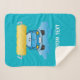 Um carro azul sorridente lavando-se com pincel de lavagem de roupa. Texto personalizado.