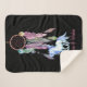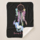 Este cobertor de sherpa tem um cavalo branco e azul mágico, uma bonito caçadora de sonhos e o texto "Sonhos e Desejos".