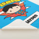 Veja Chibi Superman voando nas nuvens com seu nome super-herói sobrevoando e forma vermelha de escudo de bolinhas atrás dele.