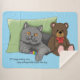 Gato de taça britânico de cinzas bonitas sentado com um brinquedo de gato e um ursinho de pelúcia. O gato espera que o seu anterior mal-estar em que se envolveram seja responsabilizado pelo cão.