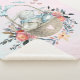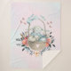 Um cobertor sherpa com uma ilustração criada com aquarelas. Um coelho bonito vestindo um vestido azul sentado em uma cesta cercada por seus ovos. Borboletas à volta da cesta que é decorada com um buquê de flores de rico.