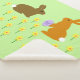Este maravilhoso cobertor de xerpas apresenta um par de belos coelhos de Páscoa cercados por flores amarelas de daffodil. Os coelhos são castanhos com orelhas grandes, olhos negros e caudas brancas lisas. Um dos coelhos está segurando um ovo de Páscoa com um bonito arco roxo nele e está se aproximando para oferecê-lo ao outro coelho. Os daffodils são amarelos com um centro laranja brilhante.