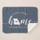Mostre algum orgulho do estado de casa com este cobertor giro azul de arremesso que apresenta "home" em letras brancas de escrita de caligrafia com um mapa da silhueta do estado de Missouri em pé para a letra "O". Um dentro de ilustração do coração vermelho no mapa do estado completa o design; você pode mudar a posição do coração para sua cidade natal abrindo a ferramenta design e arrastando a forma do coração para seu lugar favorito. Personalize com a sua cidade natal, o nome da família e o ano estabelecidos para criar um presente perfeito e memorável de inauguração ou adição à sua nova casa.