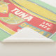 Uma ilustração retrógrada do estilo publicitário de uma lata de atum. Esta lata de peixe tem um rótulo que diz que o atum é elevado em Ômega 3 e que é pescado de forma sustentável. Mente para qualquer um que goste de comida enlatada