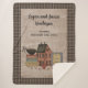 Este cobertor de Sherpa é perfeito para o seu país ou casa primitiva. Há uma casa colonial vermelha com um coração no pico, uma pilha de diferentes caixas coloridas com um corvo preto sobre elas, uma moldura azul com um bordado que diz "Eu amo os Primos", um coração vermelho e muitas cipós vermelhas. O plano de fundo é feito em um olhar de tecido de burlap com borda de xadrez de búfalos preta e bronzeada. No meu compro estão disponíveis vários outros designs de coordenação, bem como travesseiros correspondentes.