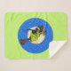 Este cobertor de velo Sherpa é verde-claro com uma bruxa engraçada segurando-a no chapéu, vestindo um vestido verde voando sobre uma lua de cheio em uma vassoura com seu gato preto cavalgando nas costas em círculos azuis com estrelas.