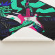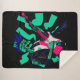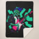 Um esqueleto robótico com um mohawk azul estilo punk toca uma guitarra elétrica rosa brilhante que emite ondas de energia elétrica quando tocado. o robô veste uma jaqueta de couro preto.