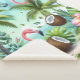 A vibrant and playful tropical design that transports you to a serene paradise. With its lively flamingos gracefully perched amidst lush palm trees, this artwork bursts with colorful blooms, fresh coconuts, and exotic greenery. The calming turquoise backdrop adds to the idyllic atmosphere, creating a refreshing and joyful vibe that's perfect for anyone who loves the tropical lifestyle.
