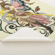 Uma fada loira Steampunk com asas rosa e azuis. A fada está vestindo roupas bonitinhas com chapéu de cima, corset e estrias, Borboletas, relógio, engrenagens e design tribal num fundo amarelo-claro