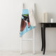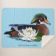 Pato de madeira na água com um lenço de água branco ao lado da suck num pano de fundo de azul