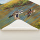 Patos-reais masculinos e femininos em voo sobre uma lagoa de ouro, água ondulando para refletir as cores da folhagem de outono de fundo brilhando à luz do sol. Trabalho de arte realista criada de uma pintura original de petróleo pelo artista da vida selvagem Crista S. Forest.