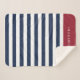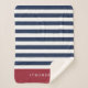 O cobertor chic sherpa náutico apresenta faixas largas, azuis e brancas, de marinho. Personalize com um nome ou nome de família na parte inferior de uma banda de vermelho profundo.