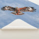 Uma pipa vermelha graciosa em voo contra um céu nublado de verão. Personalizar acrescentando o seu próprio texto A pipa vermelha (Milvus milvus) foi salva da extinção nacional no Reino Unido e foi reintroduzida na Inglaterra e na Escócia.