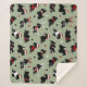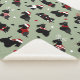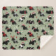 Cães escoceses bonitos vestidos com roupas festivas de férias, chapéus de Papai Noel e blusas de argila com Enfeites de natal espalhados em um fundo verde.