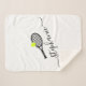 Nome personalizado do monograma num cobertor grosso sherpa, tema confortável, com um logotipo simples e moderno de raquete e bola e uma letra elegante de escrita feminina de caligrafia feminina em preto e branco.