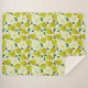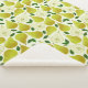 Um padrão de peras verdes vibrantes em tons de amarelo e verde com folhas verdes brilhantes. Algumas das peras são divididas pela metade para mostrar as dentro e sementes suculentas.