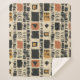 Cobertor de padrão geométrico terroso inspirado em tecidos tribais de barro, apresentando retângulos pintados à mão, diamantes e triângulos em preto carvão e terracota sobre um fundo bege texturizado. Um design boho quente ideal para amantes de decoração rústica, fãs de estilo artesanal e qualquer pessoa atraída por estética geométrica terrosa.
