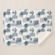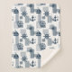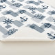 Design marítimo sem costura, com embarcação à vela, bússola, âncora e decoração das rodas de vela em fundo geométrico azul e branco