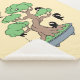 Simples ilustração de uma árvore bonsai japonesa em uma bandeja rasa. Um grupo de pequenos ninjas fez desta árvore a sua base. Vários ninjas estão escondidos atrás da folhagem. Um está balançando de uma corda amarrada a um galho, outro paira sobre a árvore amarrada a uma pipa.