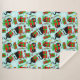 Gato preto bonito dentro ou em volta de presentes de Natal vermelhos e verdes embrulhados com flocos de neve contra um pano de fundo azul claro