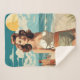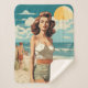 A imagem é uma vibrante poster ao estilo pop, que mostra uma cena de praia de verão dos anos 50. Uma mulher confiante com cabelos ondulados volumosos, vestindo um maiô branco e laranja na moda, está em primeiro plano. Ao fundo, outros batedores estão desfrutando de várias atividades ao longo da costa, com um sol brilhante brilhando em um céu azul pontilhado com nuvens. A estética total combina a moda retrorativa com uma atmosfera viva e nostálgica.
