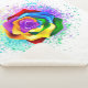 Rosa grande e florescente com pétalas arco-íris sobre fundo branco, pintadas com pedaços de tinta colorida e brilhante. 3d