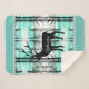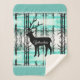 Este cobertor quente e aconchegante do Sherpa é mostrado em uma bonito floresta Yellowstone Deer impressão com detalhes de imagens de árvore de tamanho pequeno ao longo da borda colorida aqua de cor sólida com faixas de acento de cinza. Tamanho pequeno mostrado. Personalizar este cobertor ou comprar conforme mostrado.