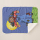Este cobertor de velo Sherpa tem um espantalho sorridente em macacões azuis e uma camisa de xadrez na grama com um corvo em cada ombro e um gato preto em seus pés com uma lua amarela cheio atrás dele.