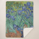 Este belo cobertor de sherpa é inspirado pelos irlandeses pintados por Vincent van Gogh em 1889. A imagem apresenta riscas azuis com caules verdes e folhas com pontas pontiagudas plantadas na terra vermelha-marrom.