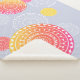Um design geométrico com mandala aleatória e vibrante inspirou círculos, em amarelo, laranja e rosa, contrastando com um fundo azul-claro/violeta.
