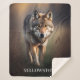 Este cobertor do lama de sherpa é mostrado em uma impressão de foto de um lobo. Texto de Yellowstone escrito perto do fundo. Personalize este item ou comprar conforme projetado. Imagem licenciada