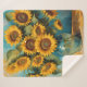 Dit schilderij toont een levendig boeket zonnebloemen tegen een kleurrijke, impressionistische achtergrond. De zonnebloemen, met hun heldergele bloemblaadjes en groene bladeren, stralen warmte en energie uit. De blauwe achtergrond vormt een mooi contrast met de warme kleuren van de bloemen, waardoor het geheel een harmonieuze en levendige compositie vormt.