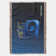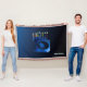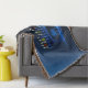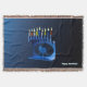 Uma menorah Chanukkah moderna, metálica, azul, apresentando um leão na silhueta, contra um fundo escuro, noturno. Todas as nove velas estão acesas. O texto "Happy Hanukkah" também aparece em azul e branco brilhantes.