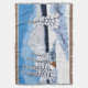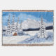 A throw blanket with a beautiful winter scene including snowy mountains, rustic cabin and evergreens in heavy snow. Original artwork by W.B.