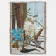 Gato da Floresta Norueguesa sentado ao lado de uma árvore com um dragão azul sentado num capacete de garrafa. Neve ao redor deles, espada e machado viking com eles.