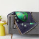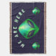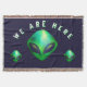Cool fun throw blanket with a printed image of 3/three green alien heads on a very dark blue background, with a caption/phrase which reads "WE ARE HERE"