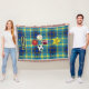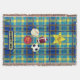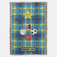 Amarelo e Xadrez azul colorido lança design cobertor com bolas de esportes gráficos e uma estrela amarela grande exibindo a palavra Superstar. Duas áreas para personalizar texto. presente de excelente para jovens amantes do esporte.