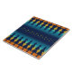 Inspirado nos belos céus de pôr do sol e nos pinheiros altos de Ponderosa do Arizona, esta obra de arte original apresenta um céu de pôr do sol laranja, amarelo e azul brilhante por trás de árvores ponderosas geométricas e estrelas em um padrão de estilo de cobertor de sela.