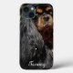 cobrir iphone, cavaleiro spaniel, Rei Charles Cavalier Spaniel. Cavalier spaniels são os cachorros mais doces do planeta! Aqui está um lindo Cavalier preto e bronzeado pronto para manter seu telefone livre de arranhões. Cores vivas e muitos detalhes interessantes. Caso do iPhone 11 12 13 com foto e nomePersonalize com um nome. Escolha o caso certo para seu iPhone 11, 12 ou 13. Cavalier Spaniel Art de Carol Cross