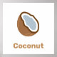 Coco castanho sobre fundo branco com palavras marrons. Ajude o seu pequeno a aprender frutas com este design de coco.