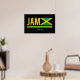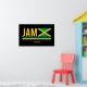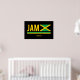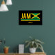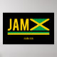 A bandeira nacional da Jamaica está sentada ao lado do código ISO Alpha 3 para a Jamaica. Abaixo estão três faixas coloridas nas cores do sinalizador mais o nome do país.