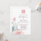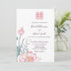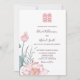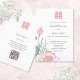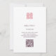 Este convite de casamento floral apresenta uma pintura em aquarela de uma flor de lótus e um símbolo de dupla felicidade em um tom rosa correspondente em um fundo branco. No verso há um código qr escaneável para o site do seu casamento.