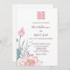 Este convite floral apresenta uma pintura de aquarela de uma flor de lótus e um símbolo de felicidade dupla num tom cor-de-rosa correspondente num fundo branco. No verso está um código qr digitalizável para o seu site de casamento.