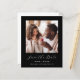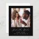 Este simples e minimalista Cartão Salvar a Data contém uma foto quadrada acima das palavras "Salvar a Data" no elegante guião branco, seguido pelos nomes do casal, data do casamento e cidade em sans serif em um fundo preto. Adicione uma mensagem mais detalhada com informações adicionais no verso, juntamente com um código QR que envia convidados para o seu site de casamento.