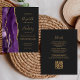 A borda esquerda apresenta uma borda agitada de cor púrpura, aparada com brilho dourado. O texto personalizável combina manuscrito dourado, fontes em copperplate e itálico em um fundo preto de slate. O verso fornece espaço para detalhes do casamento em um fundo preto de slate sólido, junto com um código QR que os convidados podem digitalizar para visitar seu site e RSVP, o que economiza o custo de imprimir e enviar cartas RSVP separadas.