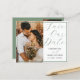 Elegante, salvar o anúncio de data é perfeito para pôr em marcha seus planos de casamento. Apresenta um modelo de fotografia e uma grande tipografia 'salvar a data' em verde-sábio sobre fundo branco. Personalize com seus próprios detalhes.