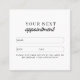 Uma bela maneira de reservar seu próximo compromisso com este cartão de compromisso profissional preto. O cartão de compromisso do cliente pode ser personalizado para seu texto, código QR, identificador de mídia social e detalhes comerciais.