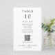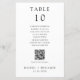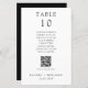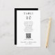 Cartão de número de mesa de casamento preto e branco, simples e minimalista, com lista de assentos de nomes de convidados e código QR personalizado para menu de casamento